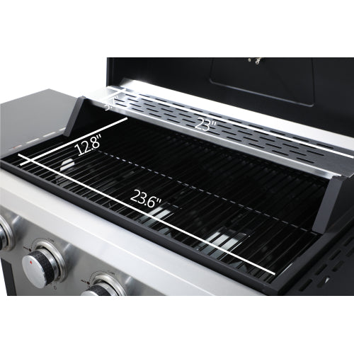 CAHEX 4-Burner Propane Gas BBQ Grill, 34200BTU Output With Wire Enamel Cooking Grids For Outdoor Barbecue, Foldable Side Table, Hanging Basket, Stainless Steel